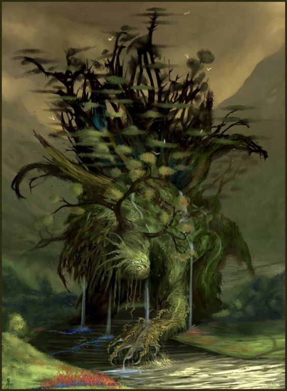 They creep forward, and suddenly the mists clear up substantially, revealing that they appear to be outdoors somehow. The two voices are from a couple of figures standing behind a boulder. They move forward and address the figures, who are dressed oddly (later speculation was that these two were dark elves) and apparently engaged in observing something beyond the rock. They offer to introduce the pair to whomever is there. She goes around the rock and discovers that what they're talking about is a gigantic being made of earth and plants, even trees.