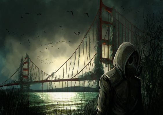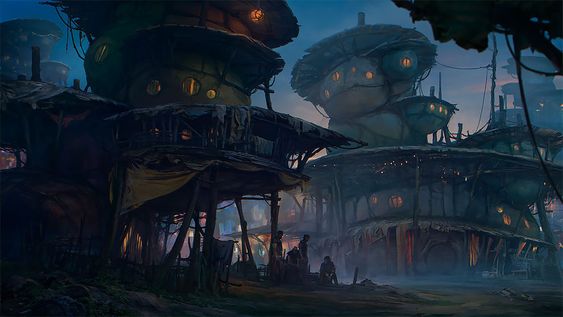 View of the ancient bridge that leads away from Alalit to the Penisula proper, across the estuary of the toxic river that leads into Horse Bay beyond, as seen from the base of the cliffs below Alalit, near the hidden entrance to the Holy Temple of Cam. A pod of obbs takes flight from the bridge.